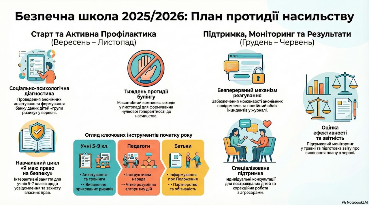 План заходів щодо створення безпечного освітнього середовища, запобігання та протидія проявам насильства (булінгу, цькуванню) на 2025/2026 навчальний рік